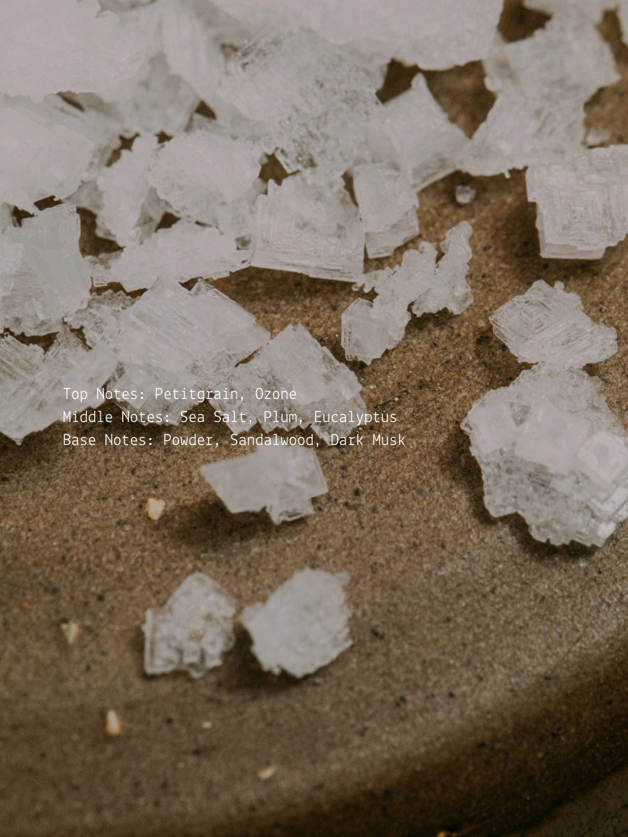深い静けさと、空気がすっと整うような清らかな余白をイメージしたフレグランスキャンドル。トップではプチグレンとオゾンが澄みわたり、ひんやりとした透明感が空間に広がります。ハートノートはシーソルト、プラム、ユーカリが静かに交差し、瑞々しさの中にどこか影を感じる、流れるようなアコードへ。軽やかさと深みが同時に立ち上がる香りが、ゆったりと意識を整えていきます。ラストはパウダー、サンダルウッド、ダークムスクが穏やかに溶け合い、落ち着きのある温もりと深い安心感を残します。