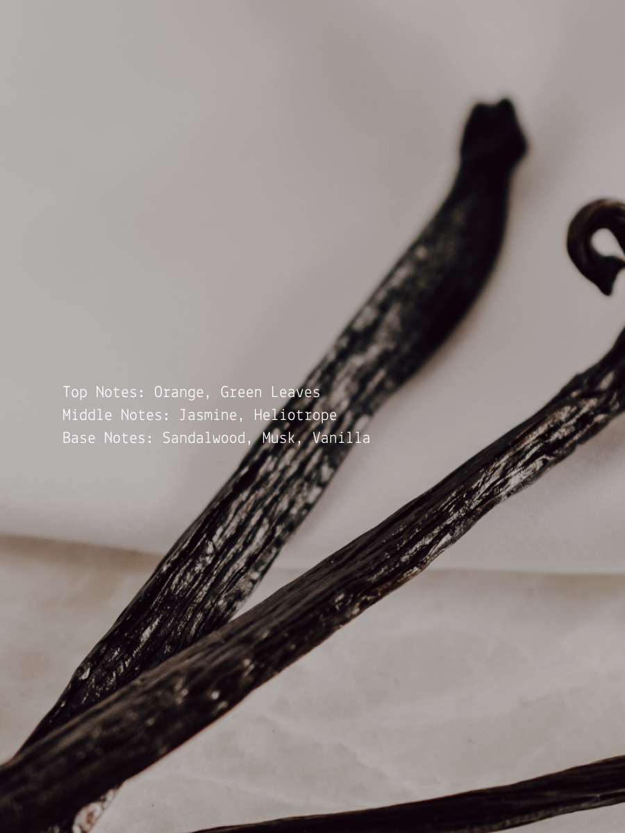 やわらかな時間と、そっと心がほどけるような静かな喜びをイメージしたフレグランスキャンドル。トップではオレンジとグリーンリーフがみずみずしく広がり、空間に明るく清々しいニュアンスを添えます。ハートノートはジャスミン、ヘリオトロープ、ランが繊細に重なり合い、やさしく包み込むような親密さと、ほのかな幸福感を運ぶフローラルアコードへ。ラストはサンダルウッド、ムスク、バニラがゆっくりと溶け合い、柔らかな温もりと落ち着いた余韻を演出。